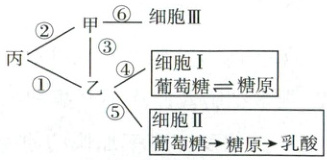 14. 甲、乙、丙三种细胞外液及生活在其中的细胞(其中一种是肝细胞)之间的物质交换关系如图所示,①②③④⑤⑥表示物质交换过程,其中只有过程①②的物质交换是单向的。下列叙述正确的是