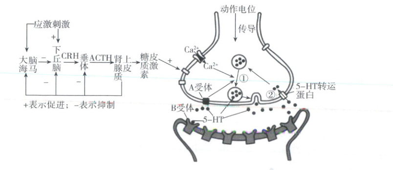 主要表现为情绪低落、兴趣减退、精力缺乏等。大量研究表明,抑郁症的发生与突触间隙中的5-羟色胺(5-HT)等单胺类神经递质的缺乏有关。5-HT是一种能使人产生愉悦情绪的神经递质。大脑海马既能调节情绪,也是HPA轴(下丘脑—垂体—肾上腺皮质轴)的调节中枢。HPA轴功能亢进是抑郁症患者重要的生理变化之一,其相关机理如图所示。回答下列问题。(1)图示糖皮质激素的分泌过程的调节机制为