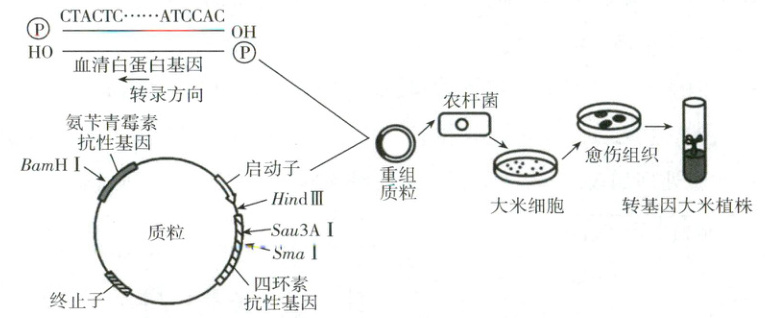 的识别序列。在农杆菌感染的操作步骤完成以后,需要对所有受体细胞进行筛选的原因是并不是所有受体细胞都成功导入血清白蛋白基因