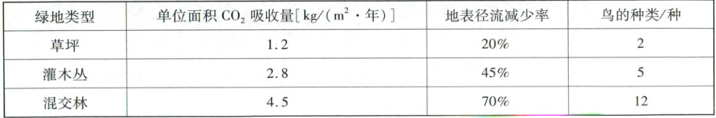(答出2点)。(4) 若某地区常年暴雨频发,结合表格信息,从减少水土流失的角度考虑,优先选择的绿地类型为