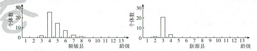 14. 【2026湖南雅礼中学考试】新疆野苹果是现代栽培苹果的原始祖先,近年来,由于受到病虫害、过度放牧等影响,新疆野苹果已处于灭绝的边缘。如图为额敏县和新源县新疆野苹果种群年龄结构分布图。下列叙述正确的是