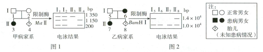 11. 如图1为甲病家系图,图2为乙病家系图,分别用限制酶MstⅡ、BamHⅠ切割两个家系成员的相关基因并电泳。已知甲、乙病均为单基因遗传病,不考虑X、Y染色体的同源区段,下列相关叙述错误的是