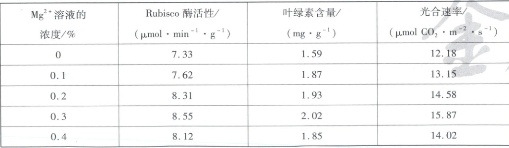 ,其机制可能是Mg²⁺通过提高Rubisco的酶活性从而提高光合作用的暗反应速率,另一方面Mg²⁺参与叶绿素的合成,提高叶绿素的含量,从而提高光合作用的光反应速率