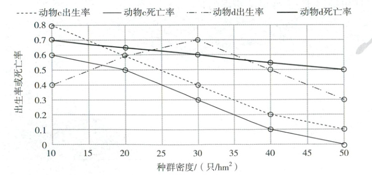 分析d动物的出生率和死亡率可知,种群密度为20只/hm²时,调查c、d两种动物的范围可能不同,故这两种动物的种群数量不一定相同,B错误。随着种群密度的增加,出生率先小于死亡率,再大于死亡率,后小于死亡率,即d动物的种群数量先减小后增加再减小,B、C错误。