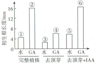 D.比较①②④⑥组可以得出,IAA通过促进GA的合成来促进植物初生根生长