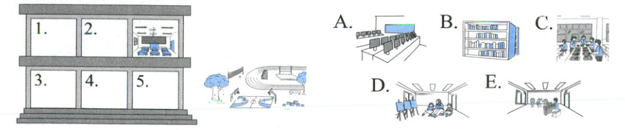(一)请根据 Sandy 的介绍来完成学校布局图,将序号填入 1~5 空白处。