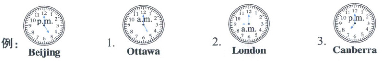 1.It’s five o’clock in the morning in Ottawa. 2.It’s nine o’clock in the morning in London. 3.It’s seven o’clock in the afternoon in Canberra.