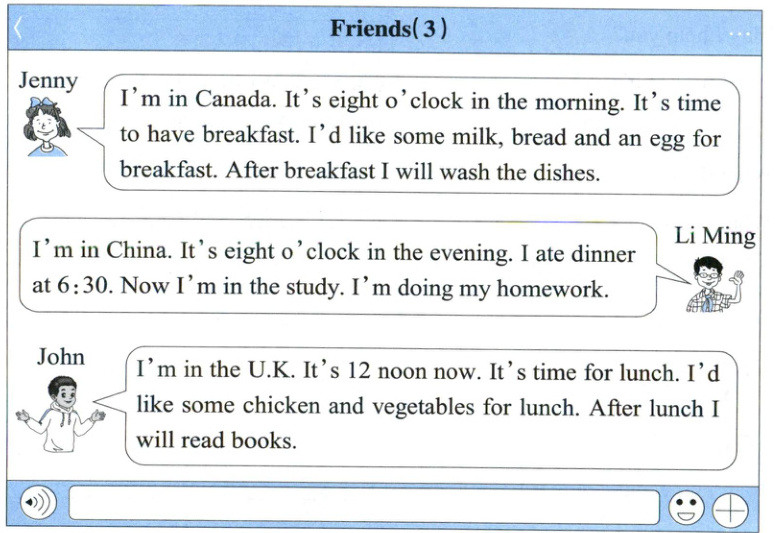 五、新情境生活运用 下面是 Li Ming 和他几个朋友的微信聊天记录。读一读,完成下列各题。