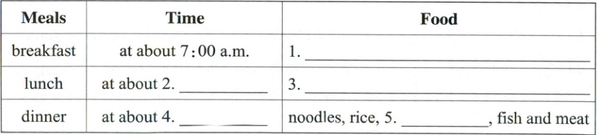 (二)1.noodles 2.breakfast; dinner 3.Lunch