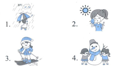 一、同学们谈论了四季的风景和喜欢的活动。听录音,给图片标序号。