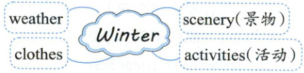 九、(张家口市期末)冬天是个美丽又有趣的季节,我们可以尽情享受冬季带来的欢乐。你眼中的冬天是什么样的?借助思维导图写一写吧!