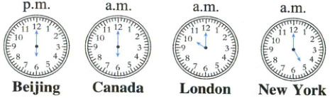 七、李明有几个朋友在国外生活,与他所在的北京有时差。请观察图片,判断句子是(T)否(F)正确。