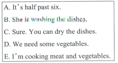 It’s six o’clock in the afternoon. It’s time for _1_. Jenny and Li Ming are hungry. Jenny’s mother is _2_ in the kitchen. Jenny and Li Ming help her _3_ the vegetables. After dinner, Mr. Smith washes the _4_ dishes. Li Ming _5_ the dishes.