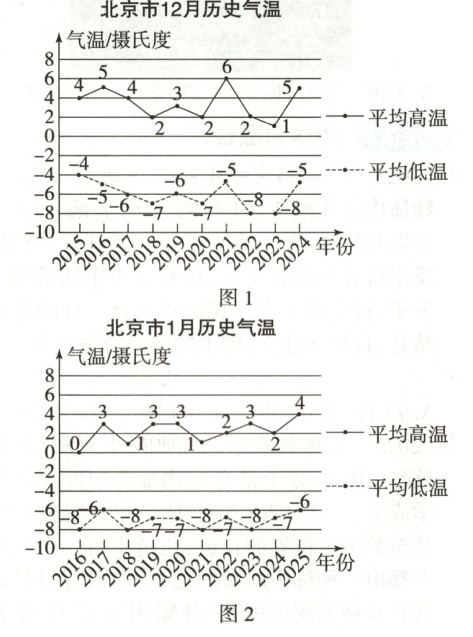 13. (2025·北京东城区高三模拟)已知近 10 年北京市 12 月和 1 月历史气温分别如图所示。
