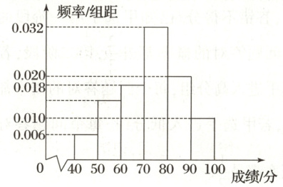 9. 某学校在寒假期间安排了“垃圾分类知识普及及实践活动”。为了解学生的学习成果,该校从全校学生中随机抽取了 50 名学生作为样本进行测试,记录他们的成绩,测试卷满分 100 分,将数据分成 6 组:$[40,50)$,$[50,60)$,$[60,70)$,$[70,80)$,$[80,90)$,$[90,100]$,并整理得到如图所示的频率分布直方图。