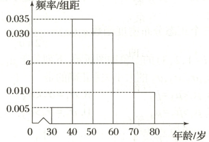 $a = 0.02$,年龄在$[30,50)$的频率为$(0.005 + 0.035) × 10 = 0.4$,