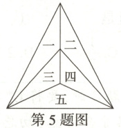 5.B[提示:先对区域三、四、五染色,有$A_4^3$种方法,若区域二和三同色,区域一可以有3种染色方案,不同的染色方法有$3A_4^3=72$(种);若区域二和五同色,区域一有2种染色方案,不同的染色方法有$2A_4^3=48$(种);若区域二与三、五颜色不同,区域一有2种染色方案,不同的染色方法有$2A_4^3=48$(种).综上,不同的染色方法有72 + 48 + 48 = 168(种).]