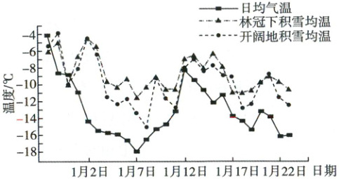 【2026届永州一模】某观测小组在天山北坡乌鲁木齐河流域进行温度观测活动。下图示意该流域积雪期监测时段内日均气温及林冠下积雪均温与开阔地积雪均温的逐日变化。据此完成9-11题。