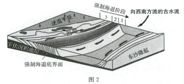 (3)简述强制海退中后期阶段形成图2中2阶段古海滩脊地貌的过程。(6分)