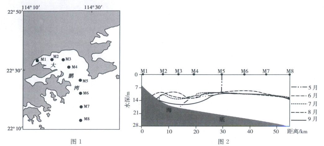 大鹏湾(图1)地处南海北部,西南季风显著的年份,湾内、湾外表层海水与底层海水会形成垂向环流。图2示意某科研团队某年夏半年统计的湾内34‰(高盐海水)等盐度线的时间演变,该图展示了垂向环流的产生及海水交换方向。