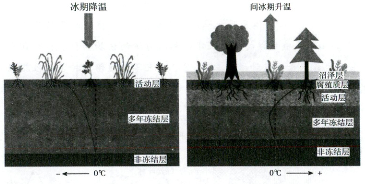 (3)分析冰期多年冻结层对植被生长发育的影响。(4分)