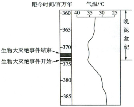 (1)据图可知,距今375百万年至距今370百万年气温相对较高,冰川融化,海水受热膨胀,海平面较高;其他时段气温相对较低,海平面也较低,故图示时期海平面变化状况随时间的变化呈现出低—高—低的特点。