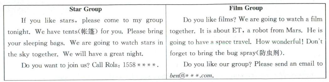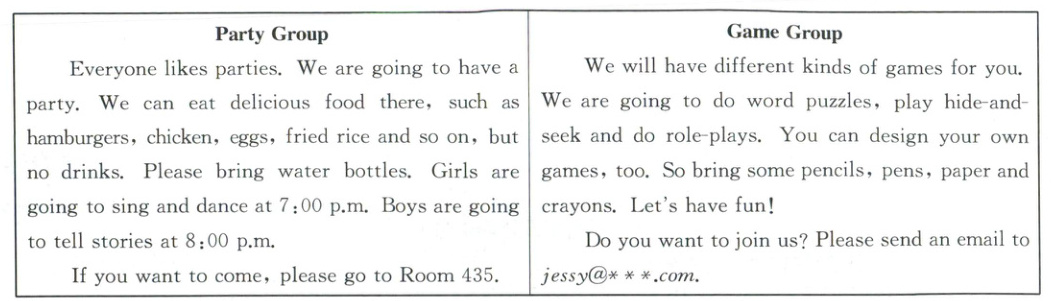 )51. If you go to the Party Group,please bring ______.A. water bottles B. sleeping bags C. hamburgers