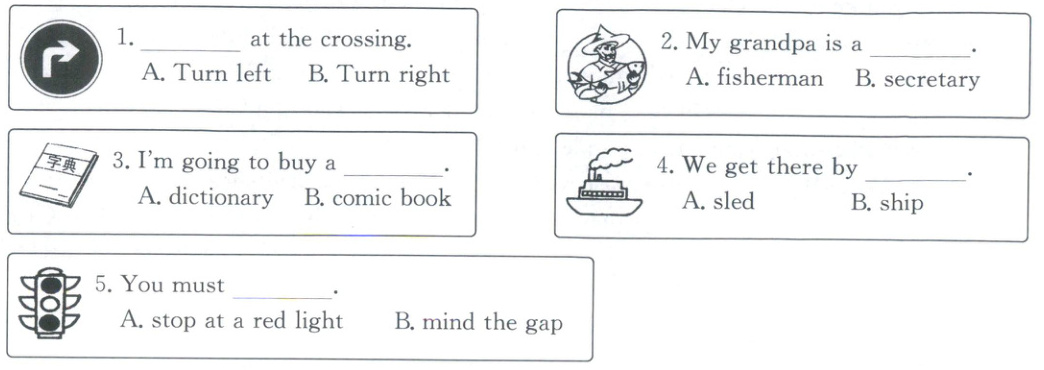 六、看图,选择正确的单词或短语完成句子。(5分)