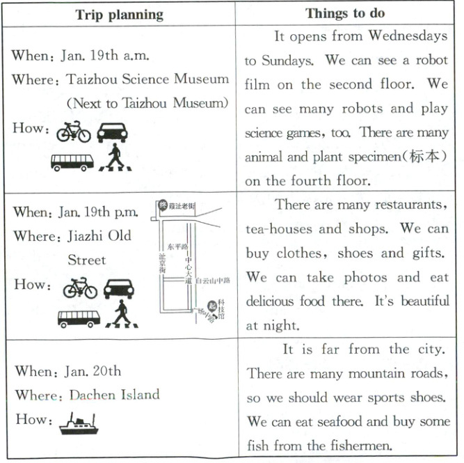 )67. When are Amy and Bob going to Jiazhi Old Street?A. On Jan. 19th a.m. B. On Jan. 19th p.m. C. On Jan. 20th.