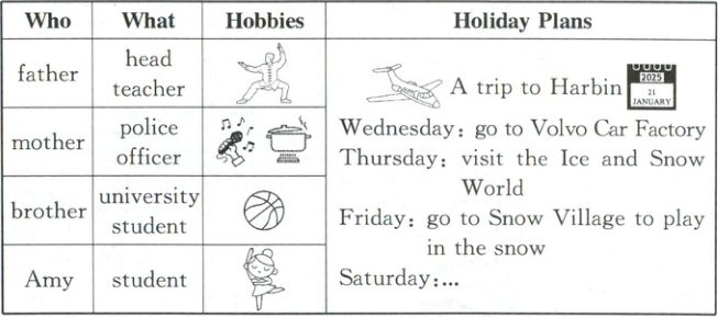 寒假里,Amy一家将跟随Bob一家去哈尔滨旅游。下面是Amy一家的个人情况和旅行计划。假设你是Amy,你能介绍一下自己的家人及旅行计划吗?