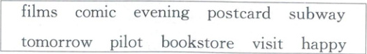 1.tomorrow 2.pilot 3.postcard 4.visit 5.subway 6.comic 7.bookstore 8.films 9.evening 10.happy
