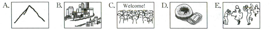 十二、黄雨婷为黄岩代言,她介绍了黄岩人民的生活,读句子,选择图片,将选项填在括号里,并根据首字母提示在横线上写出正确单词。(10分)