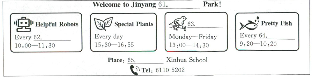 Welcome to Jinyang Nature Park! The park is in front of Xinhua School. There are four shows now. They are Helpful Robots, Special Plants, Beautiful Birds and Pretty Fish. You can see the robot show every Monday. We can't see Beautiful Birds every day but Special Plants and Pretty Fish are OK. All the shows are wonderful! Phone us at 6110 5202 to know more!