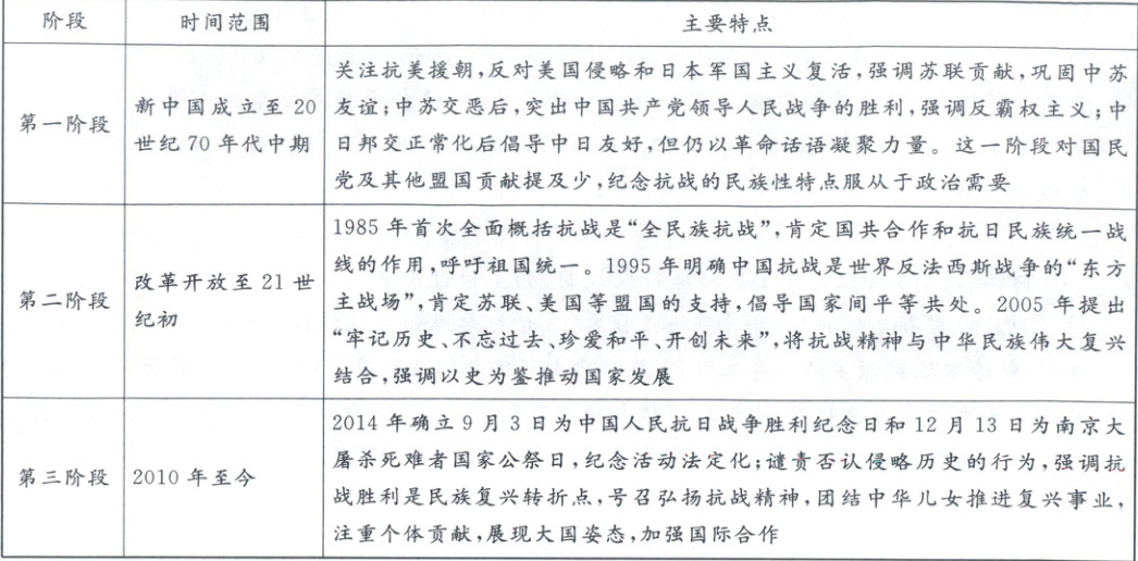 (1)阶段特征:第一阶段(1949—1965年):重视对国内民众的思想教育,强调阶级教育、革命传统教育,服务于国内政治和社会建设需要。第二阶段(1978—1995年):逐渐淡化意识形态,从阶级性转向民族性,爱国主义成为主题,抗战纪念服务于改革开放和现代化建设。第三阶段(1995年至今):抗战纪念的目的和内容日益多元化,在加强爱国主义教育的同时,将纪念活动与国家发展战略相结合,如增强民族凝聚力,为实现中华民族伟大复兴凝聚力量。(6分)