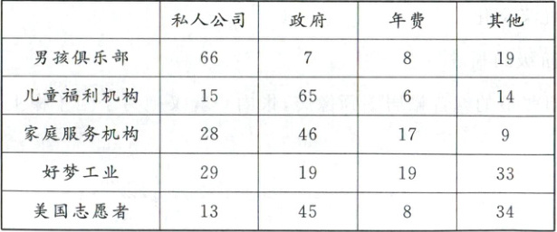 16. 下表为1986年美国主要志愿服务机构的收入来源占比(单位:%)情况。这反映出美国