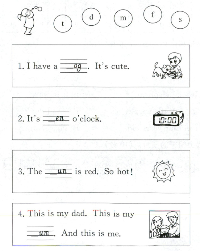 请根据单词的读音,从气泡中选择合适的字母补全单词。有一个字母多余哦!