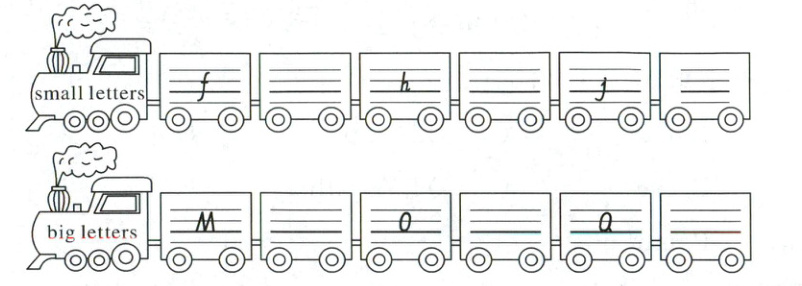 下列小火车的车厢是按字母表顺序排列的,请将缺少的字母写在恰当的位置上。注意区分大小写哦!