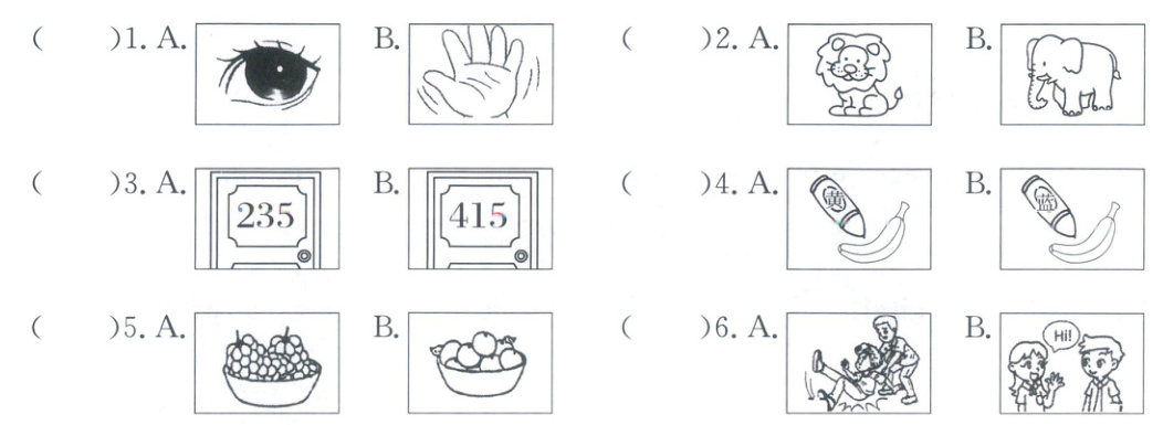 一、听录音,选出与录音内容相符的图片,并将序号写在括号里。(6分)