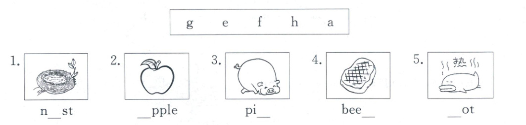 八、看图,在方框中选择字母,补全单词。(5分)