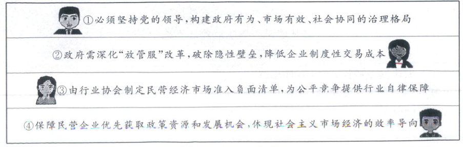 3.A 民营经济 民营经济是推进中国式现代化不可或缺的关键力量,发展民营经济,必须坚持党的领导,发挥党的领导核心作用,构建政府有为、市场有效、社会协同的治理格局,①正确。发展民营经济,政府需要深化“放管服”改革,更好发挥“有形之手”作用,破除隐性壁垒,降低企业制度性交易成本,为民营企业发展营造良好营商环境,②正确。 民营经济市场准入负面清单由政府制定,而不是由行业协会制定,③错误。 各种所有制经济在市场竞争中的地位平等,应保障民营企业平等获取政策资源和发展机会,而不是优先获取,④错误。