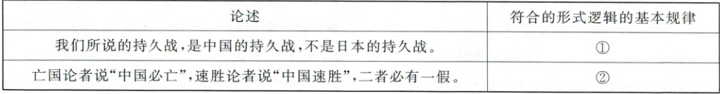 有效信息①:我们所说的持久战,是中国的持久战,不是日本的持久战→同一律要求人们在同一思维过程中,每一思想必须保持自身同一性,不能混淆概念或转移论题→在论述持久战时,始终明确是“中国的持久战”,保持了概念的确定性,符合同一律的要求。