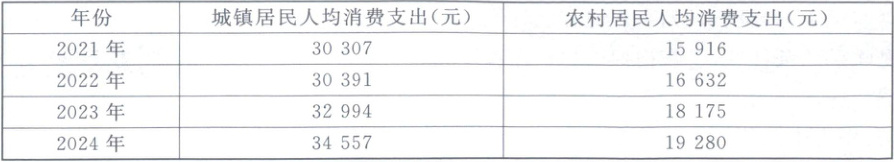4. 下表显示了2021—2024年我国城乡居民人均消费支出情况。