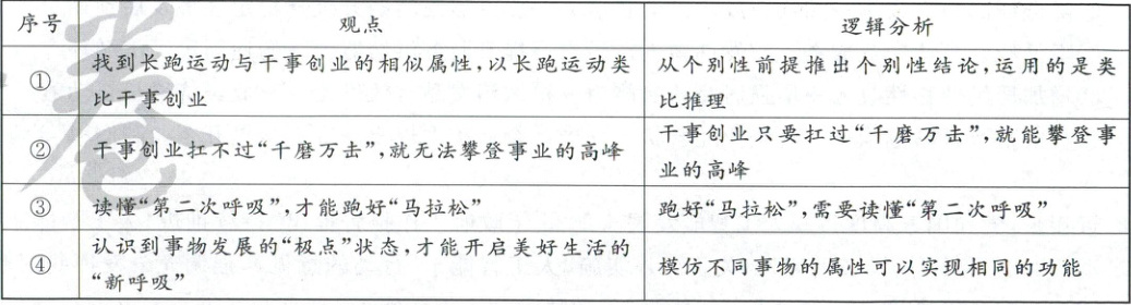 15.B 假言推理、类比推理 通过分析长跑运动与干事创业在“极点”方面的相同或相似属性,得出它们在“第二次呼吸”方面也具有相似属性,这一过程运用的是类比推理,即从个别性前提推出个别性结论,①正确;③中观点属于必要条件假言判断,而充分条件假言推理的有效性是肯前肯后、否后否前,但②中逻辑分析运用了肯后肯前的推理结构,推理有效,③正确。②中观点属于充分条件假言判断,而充分条件假言推理的有效性是肯前肯后、否后否前,但②中逻辑分析运用的是肯后肯前的推理结构,属于无效推理,②错误。模仿不同事物的属性只能进行类比借鉴,并不能实现相同的功能,且④中观点不涉及模仿不同事物的属性,④错误。
