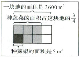 1.种蔬菜的面积 种辣椒的面积$ 3600 × \frac{3}{4} × \frac{1}{6}=450($平方米) 答:种辣椒的面积是450平方米。
