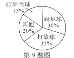 9. 如图是某班学生参加体育活动情况统计图。如果每人只能参加一项体育活动,已知踢足球的有18人,则这个班参加体育活动的一共有( )人,打篮球的有( )人。