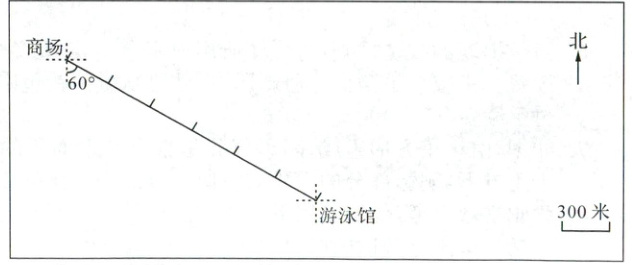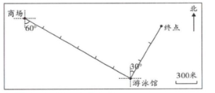 (1) 张叔叔从商场出发,先向( )$60^{\circ}$方向跑了( )m,用时12分钟到达游泳馆,再向北偏东$30^{\circ}$方向跑了900m,用时8分钟到达终点。(完成填空,并画出从游泳馆到终点的路线)(4分)