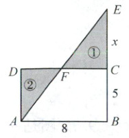 6. 如图,长方形$ABCD$的长与宽分别为$8$厘米和$5$厘米,将边$BC$延长$x$厘米到点$E$后,阴影①的面积恰好比阴影②大$10$平方厘米。求$CE$的长度。(5 分)