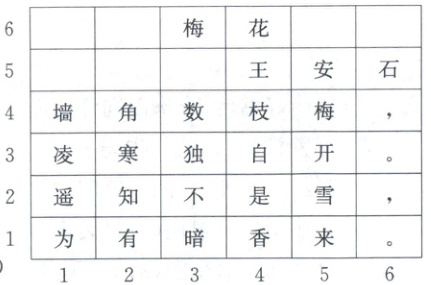 (1)如果“寒”字用数对表示为(2,3),那么“雪”字用数对表示为( , ),“枝”字用数对表示为( , ),“石”字用数对表示为( , )。
