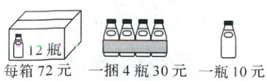 72×3+30×1+10×2=266(元) 答:买3箱加1捆加2瓶最省钱,需要266元。