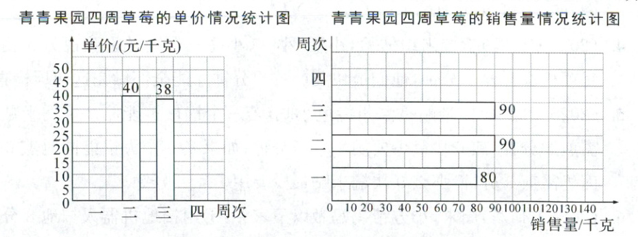 (2)40×90÷80=45(元/千克) 图略 答:第一周的草莓单价是45元/千克。